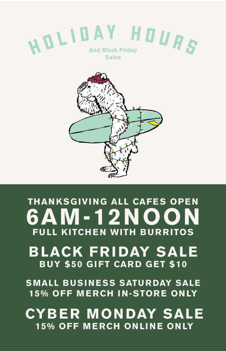 All four of our cafes are open 6am -12 noon on Thanksgiving.